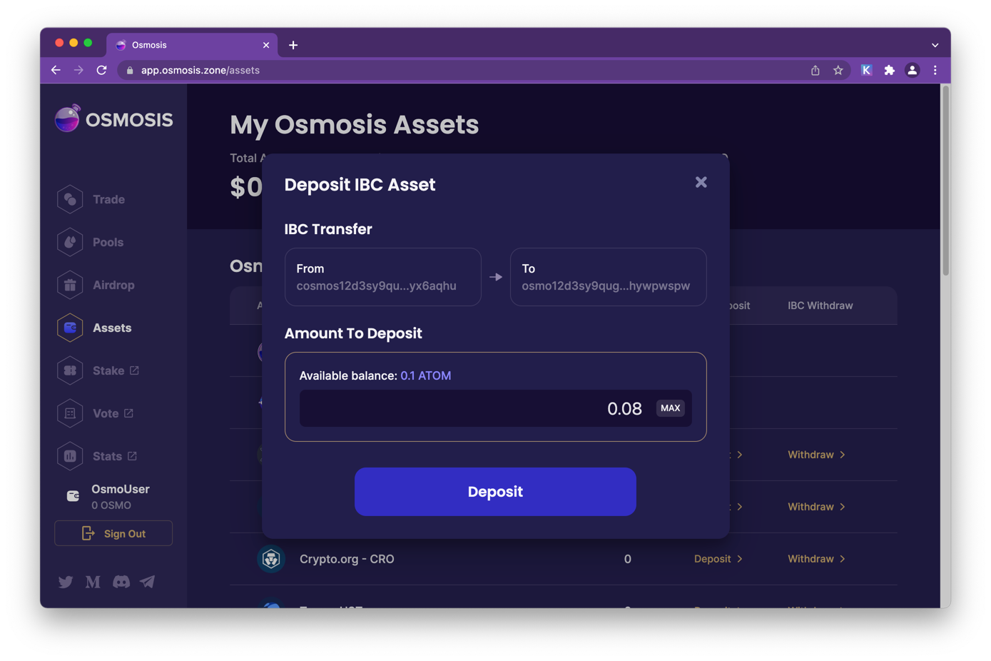Click Assets. Then click on the deposit link next to the asset name. For this example we are clicking the ATOM deposit link.