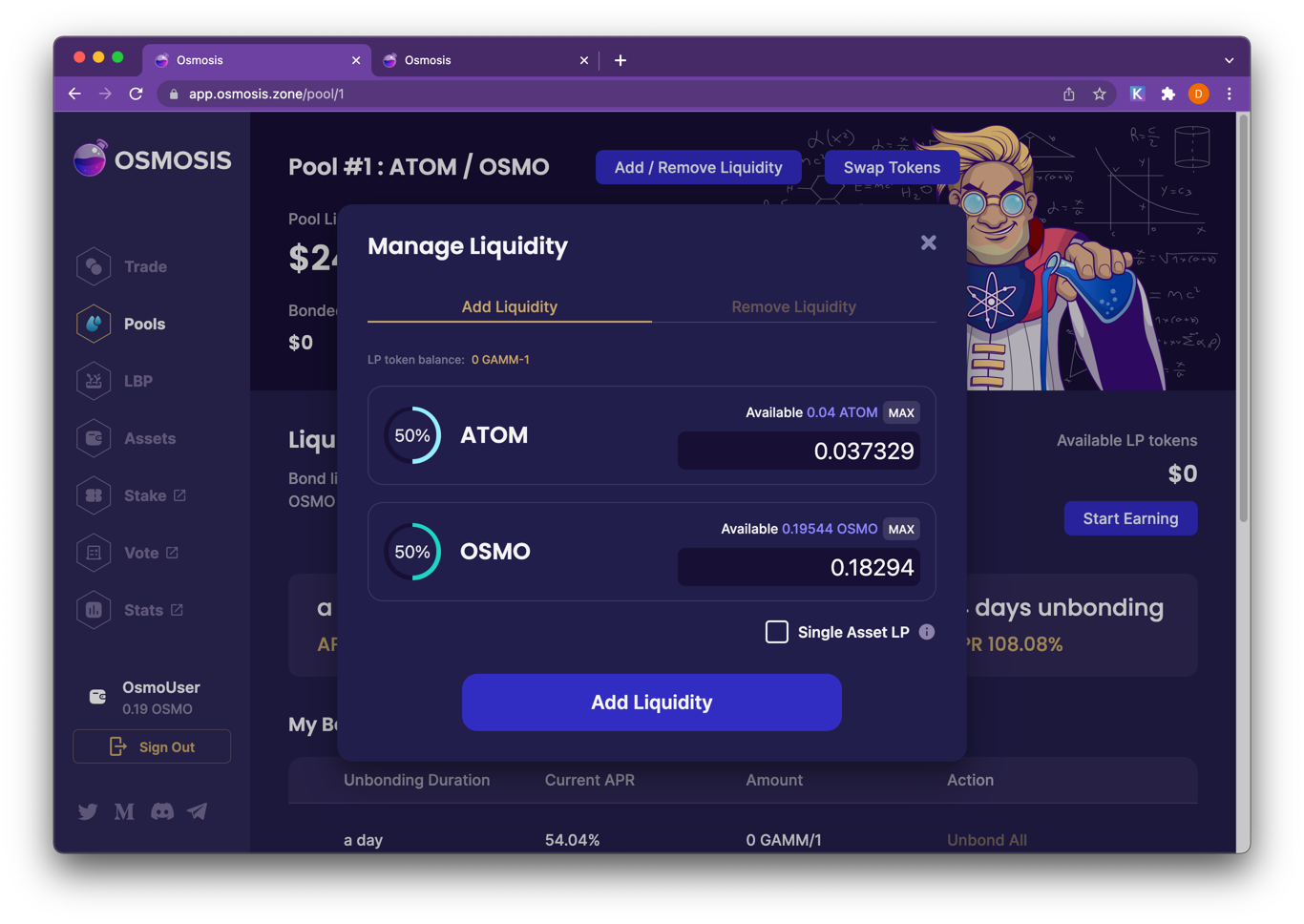 Always make sure you are connected to app.osmosis.zone name and network (osmosis-1)