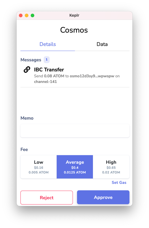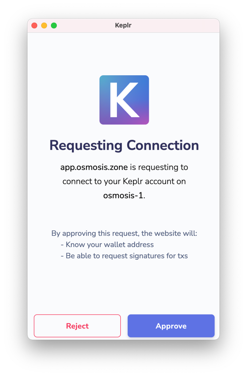 Click Approve. This confirms that you are connecting to the app.osmosis.zone and the chain osmosis-1.
