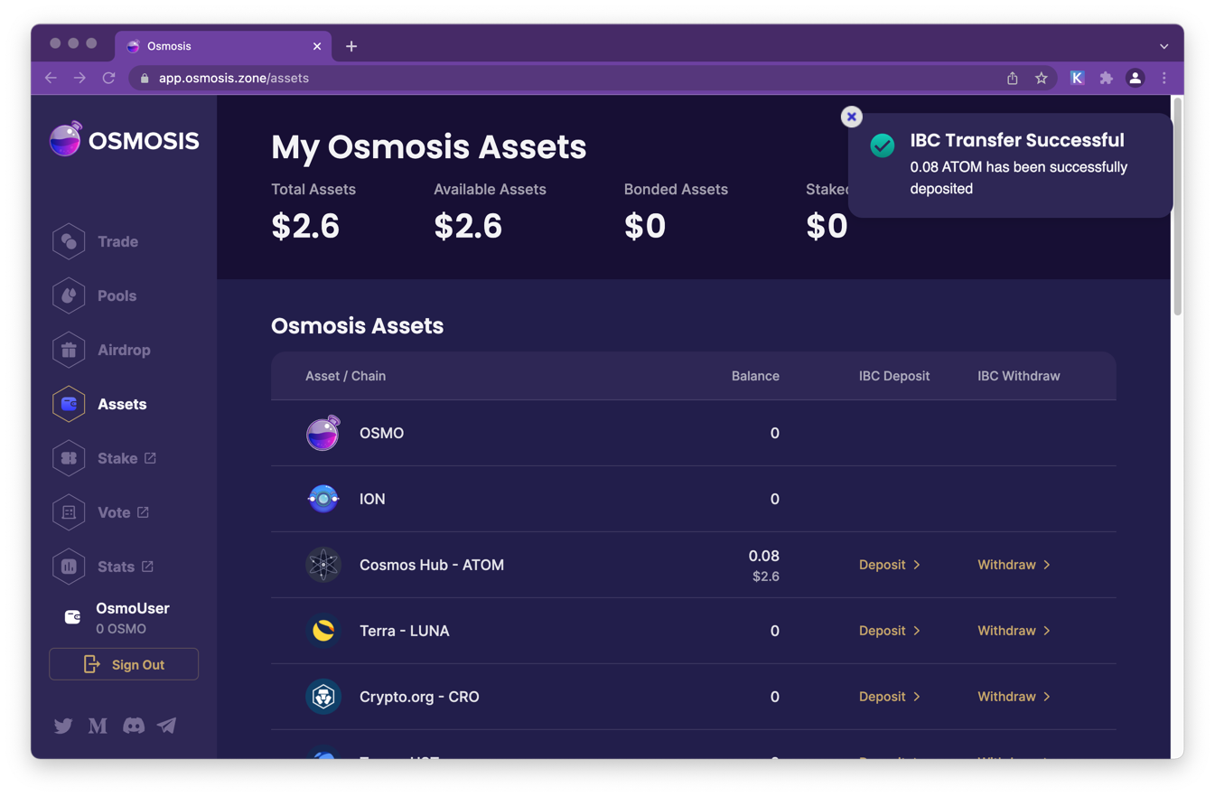 Once the transaction is completed a series if confirmations notifications will be displayed including the IBC confirmation.
