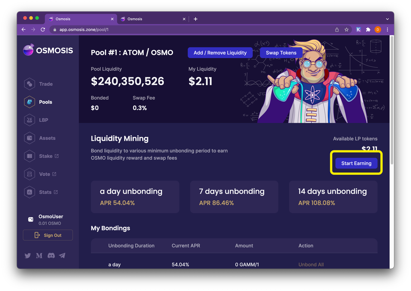 Start Earning! Users can choose to bond their LP tokens after depositing liquidity. LP tokens remain bonded for a length of their time of their choosing. Bonded LP tokens are eligible for liquidity mining rewards if they meet the minimum bonding length requirement.